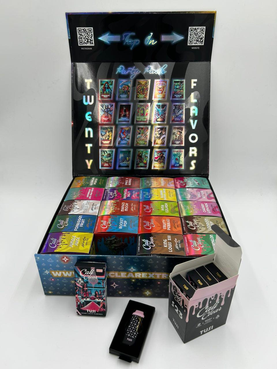The Cali Clear Party Pack is a premium collection of 20 disposable vape pens, each containing 2 grams of Liquid Diamonds cannabis extract. It’s designed for convenience, potency, and variety, making it ideal for both solo use and social gatherings.